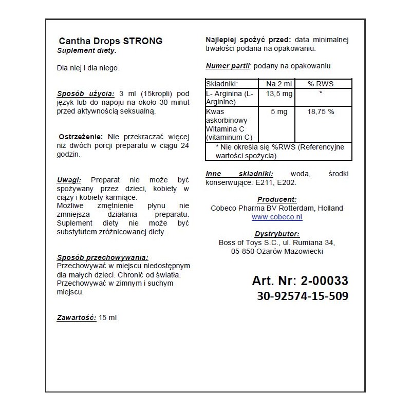 Regularne zażywanie pomaga wzmocnić doznania seksualne zarówno u kobiet jak i u mężczyzn. Wasz sex nigdy nie był ognisty i wyuzdany? Teraz może się to zmienić. Cantha Drops Strong mała rzecz, która sprawi wiele przyjemności. Zawiera kompozycję aktywnych składników, które wspomagają w szybki i dyskretny sposób jakość erekcji u mężczyzn oraz libido u kobiet. Zawarte w kroplach aktywne składniki wzmacniają organizm, działając pobudzająco, wspomaga potencję, siły witalne i energię seksualną, polepszają życie seksualne oraz przedłuża aktywność płciową.