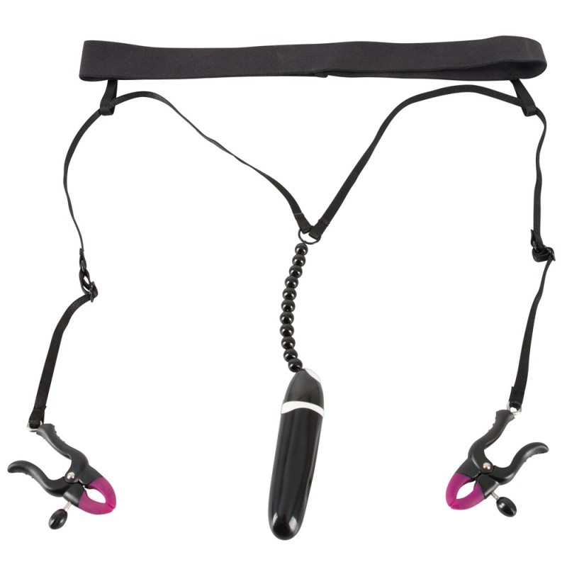 Poza zaciskami, na sznurku znajduje się mały wibrator przymocowany do sznurka za pomocą koralików do stymulacji łechtaczki. Bateria znajduje się w zestawie.