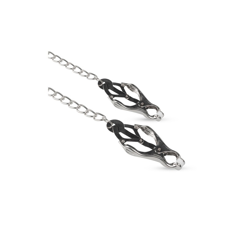 Te metalowe zaciski na sutki z kolekcji EasyToys są gotowe do stymulacji najbardziej wrażliwych miejsc. Japońskie klamry wykonane są z mocnego i wytrzymałego metalu i mają miękkie osłonki ochronne na końcach. Zaciski są wyposażone w długi metalowy łańcuch. Zimny metal i intensywne szczypanie zacisków zapewni niezapomniane wrażenia, co czyni je niezastąpionymi w kolekcji każdego entuzjasty niewoli.