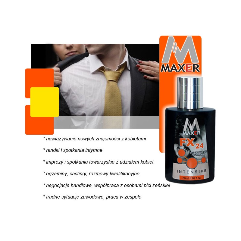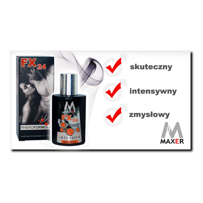 FX24 to afrodyzjak zapachowy o bardzo męskim i intrygującym zapachu, stworzony po to aby wywoływać w kobietach pożądanie i podniecenie, któremu nie będą w stanie się oprzeć. Specjalnie dobrany zestaw składników zapachowych działa na kobiety pobudzająco i sprawia, że postrzegają mężczyznę jako wyjątkowo atrakcyjnego i pociągającego. Skuteczne działanie FX24 wynika z substancji działających na zmysł węchu. Kobiety reagują na składniki zawarte w preparacie w sposób podświadomy, pod ich wpływem zaczynają odczuwać zwiększoną chęć do bliższego kontaktu, stają się pobudzone i skłonne do flirtu.
