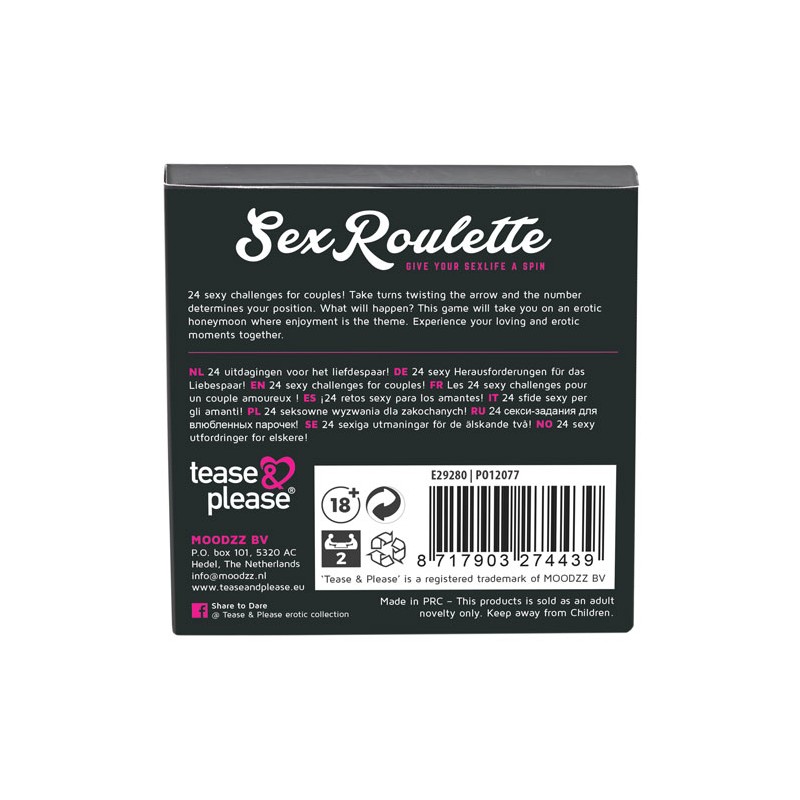 Sex Roulette to najnowsza gra autorstwa Tease and Please. Rozpal zmysłowe podniecenie w swoim życiu miłosnym jednym ruchem strzałki na desce. Strzałka wskazuje liczbę, która decyduje o tym, jakie intymne wyzwanie erotyczne czeka dla Ciebie.