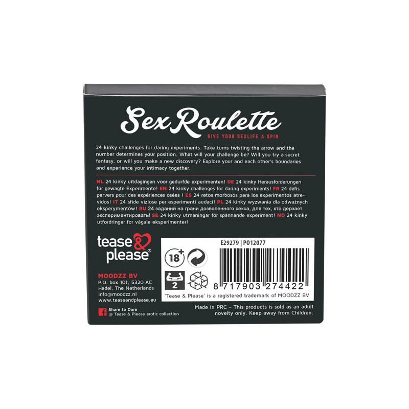 Sex Roulette to najnowsza gra autorstwa Tease and Please. Rozpal erotyczne podniecenie w swoim życiu miłosnym jednym ruchem strzałki na tablicy. Strzałka wskazuje liczbę, która decyduje o czekającym na Ciebie ryzykownym wyzwaniu.