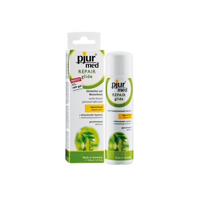 Pjur med REPAIR glide to wodorozcieńczalny, osobisty środek poślizgowy z regenerującym hialuronem do suchej i stresowej błon śluzowej pochwy. Hyaluron ma zdolność wiązania dużej ilości wody i zapewnienia lepszego smarowania. Hyaluron zapewnia optymalną regenerację skóry