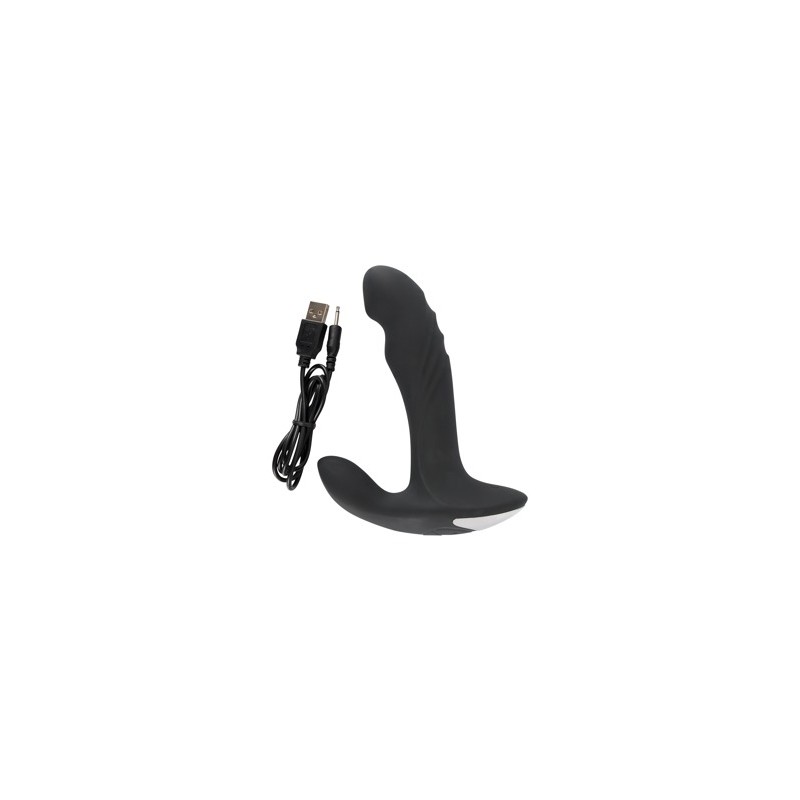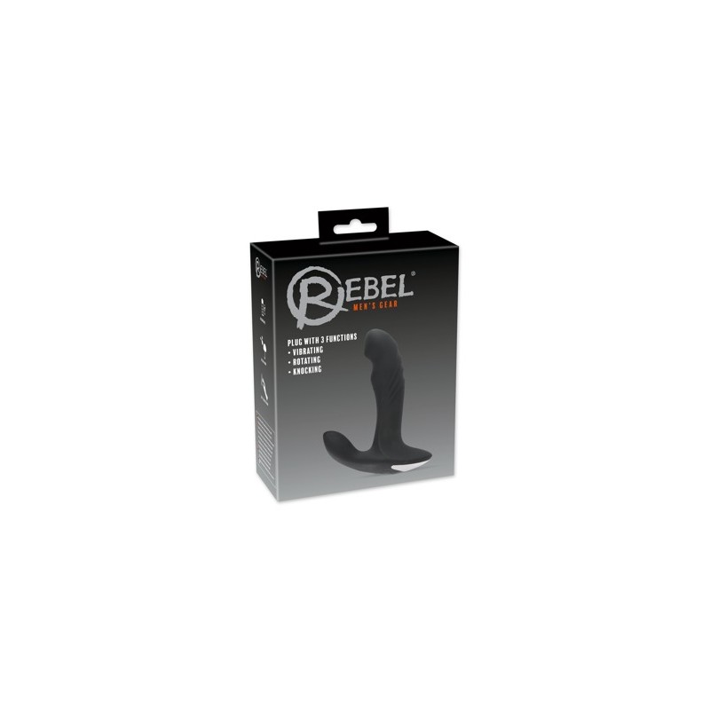 Korek z 3 funkcjami przez Rebel z reduktorem perineum, rowkowanym trzonem i zgrubieniem poniżej lekko zakrzywionej końcówki rozpieszcza 3 funkcjami mrowienia, które mogą być wszystkie kontrolowane oddzielnie: 7 trybów wibracji znajduje się w reduktorze perineum, 5 trybów stukania w końcówce i 5 trybów rotacji czeka w dolnym trzonie.