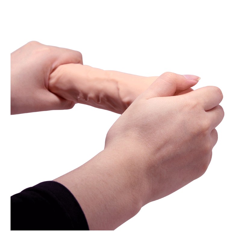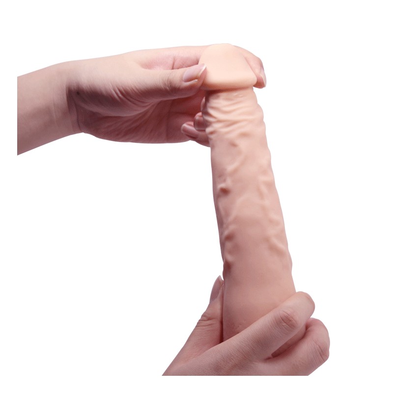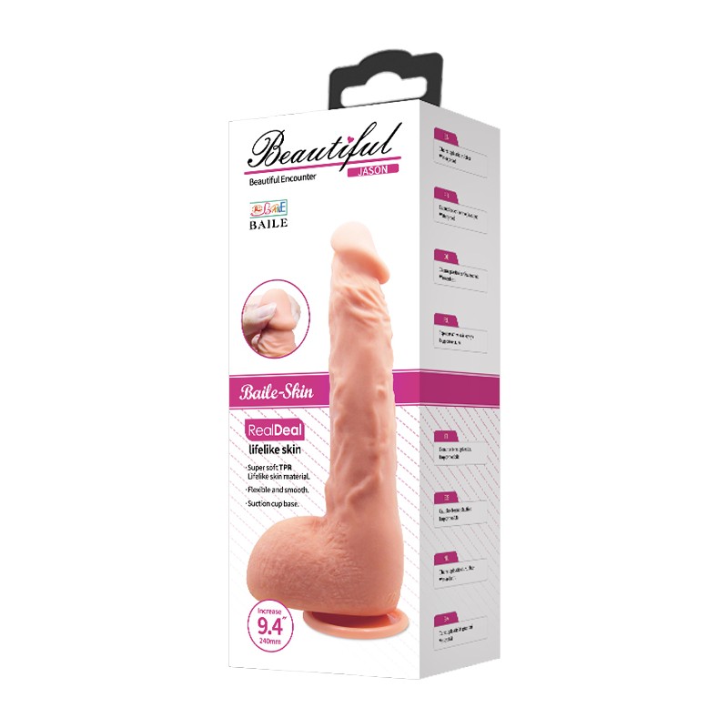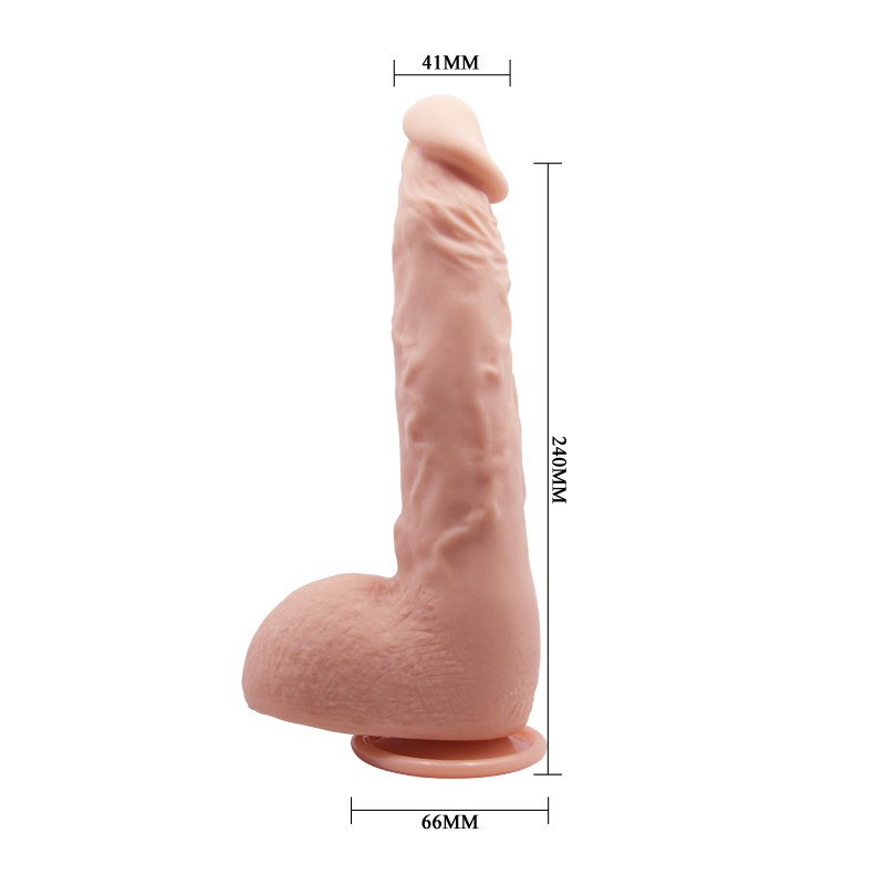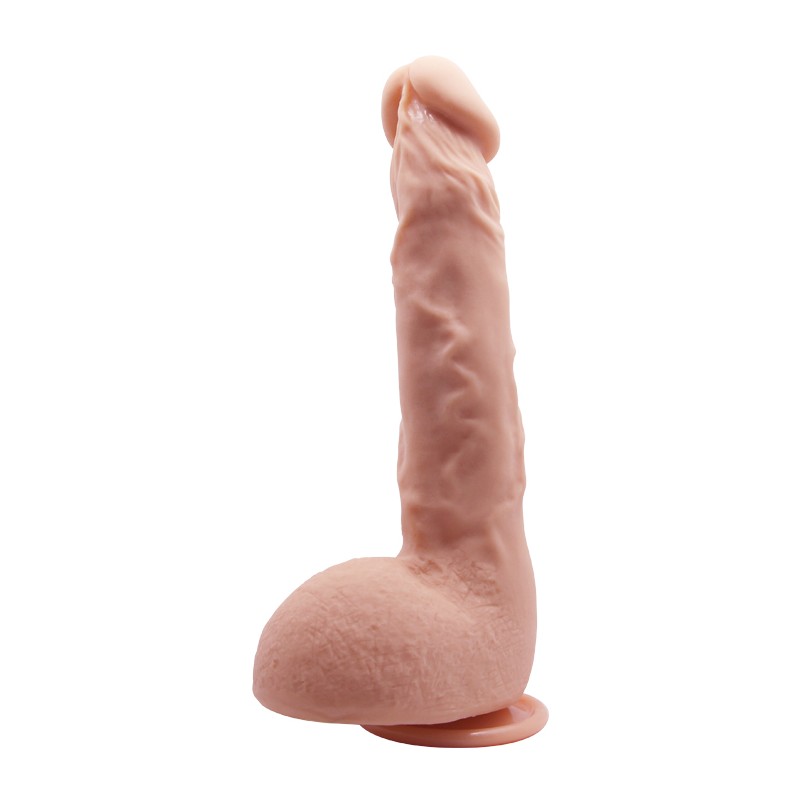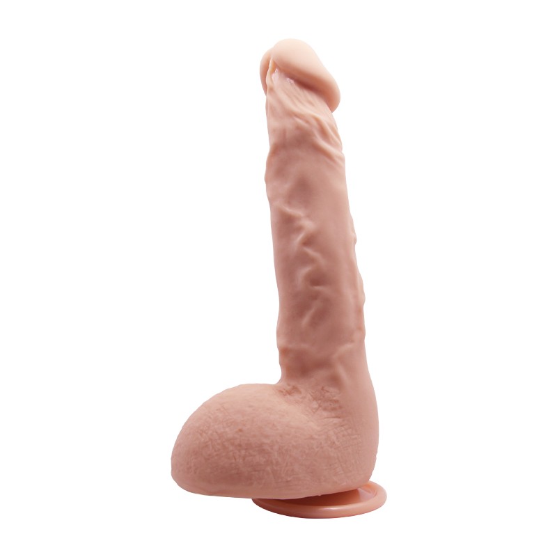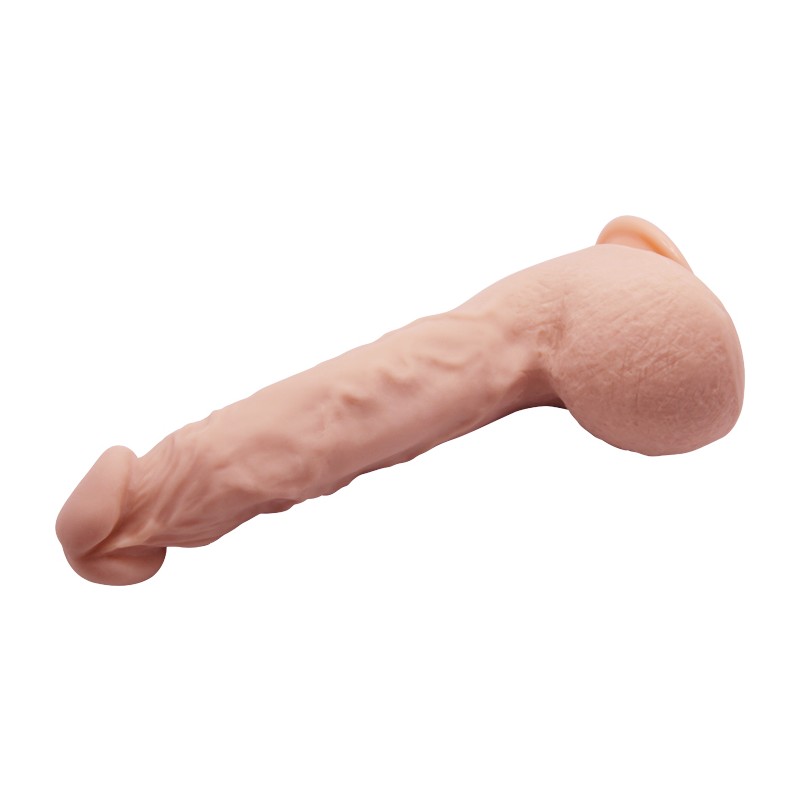 Kształt odwzorowany z prawdziwego penisa – z wyraźnymi żyłkami na długim, zakrzywionym trzonie, zmysłową żołędzią i realistycznymi jądrami o naturalnej fakturze.