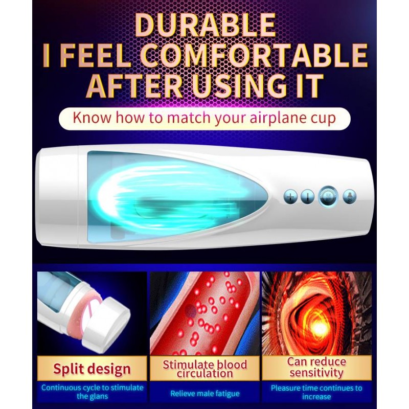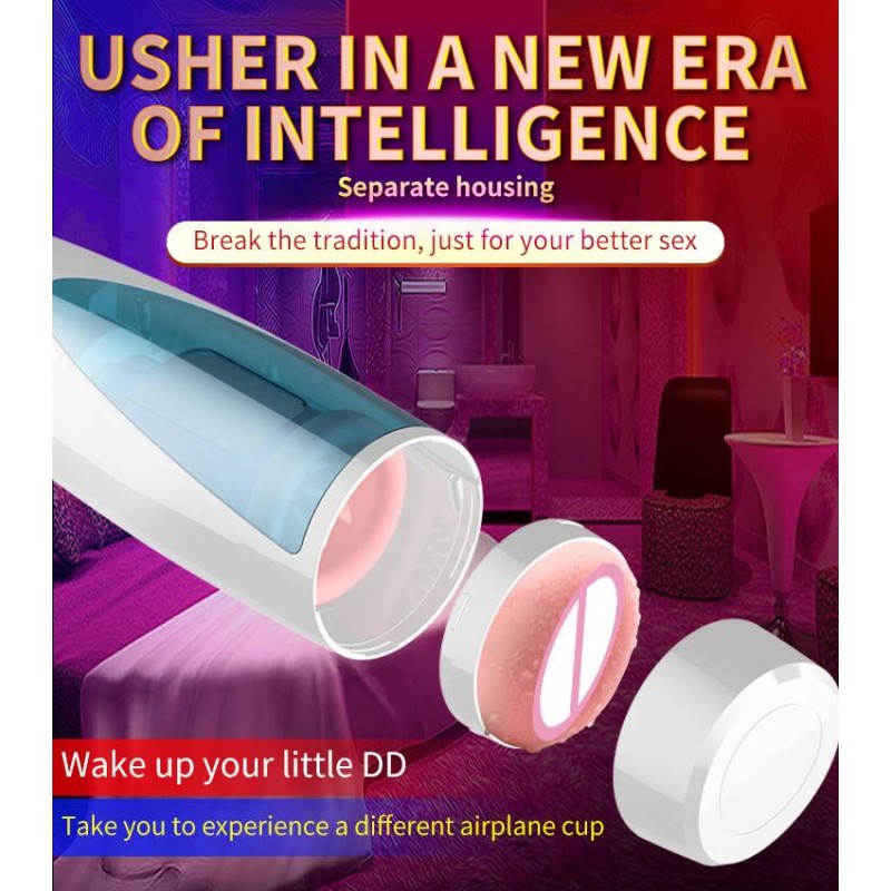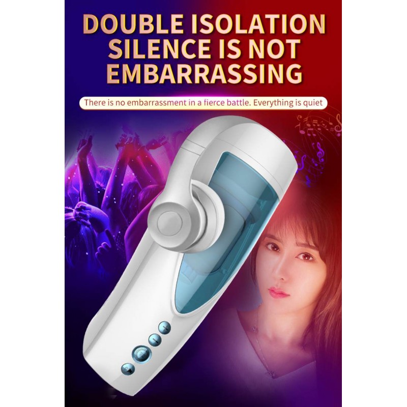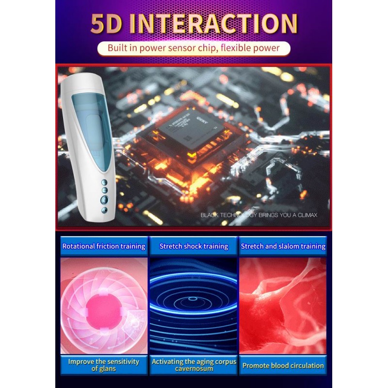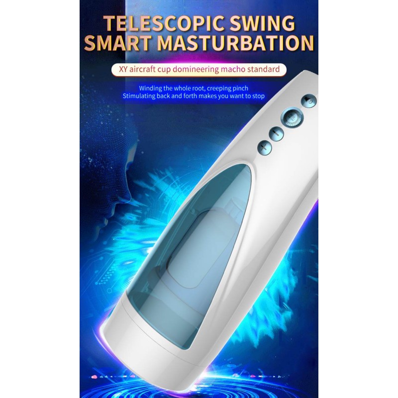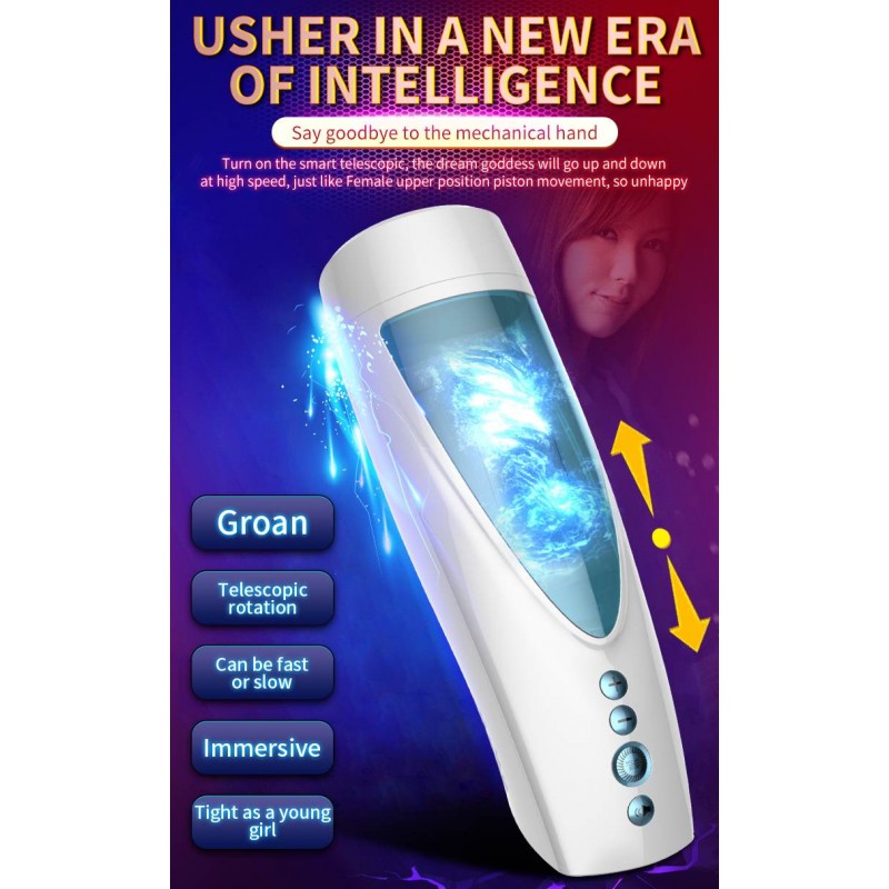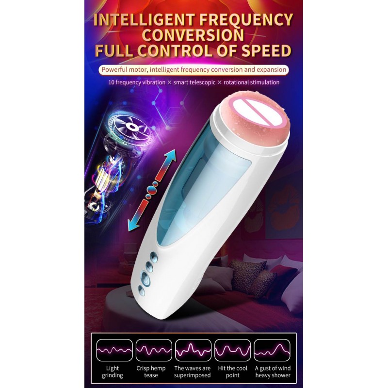 Wibrujący masturbator w połączeniu z rotacyjnym ruchem góra-dół oraz efektami dźwiękowymi i świetlnymi.