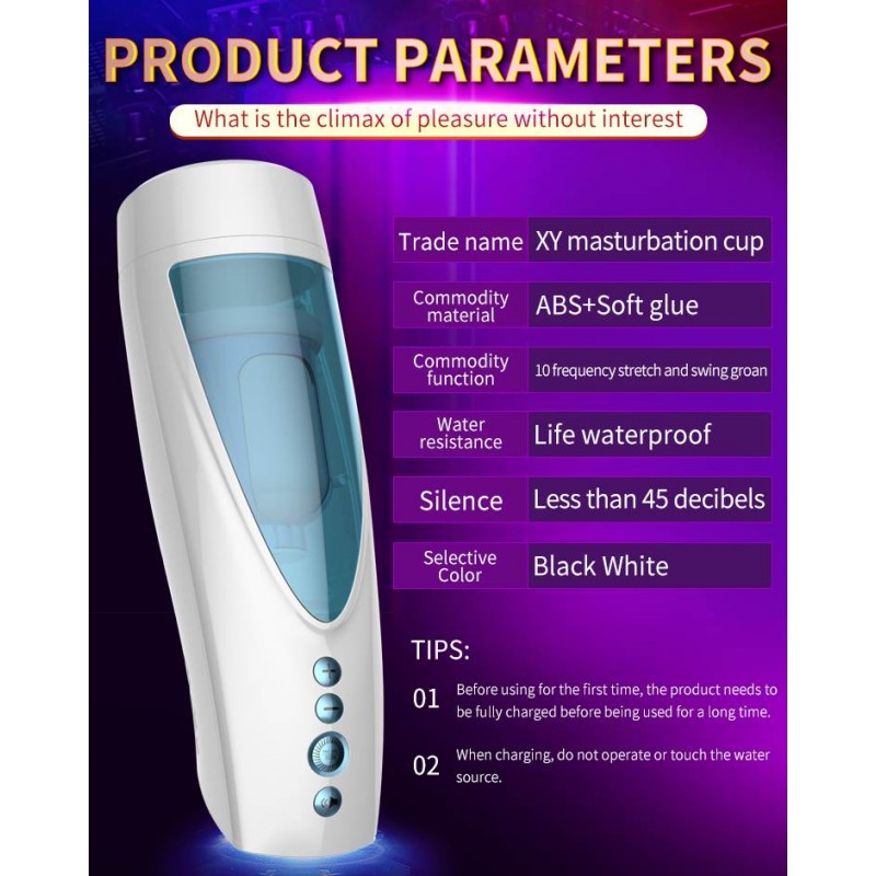 1) Krótko naciśnij duży przycisk zasilania, aby włączyć masturbator. Podświetla się panel sterowania i zabawka przejdzie w stan gotowości. Kolejne krótkie naciśnięcie włączy pierwszy tryb funkcji. Każde krótkie naciśnięcie zmienia funkcję masażera, przechodząc przez jego 10 trybów funkcji.