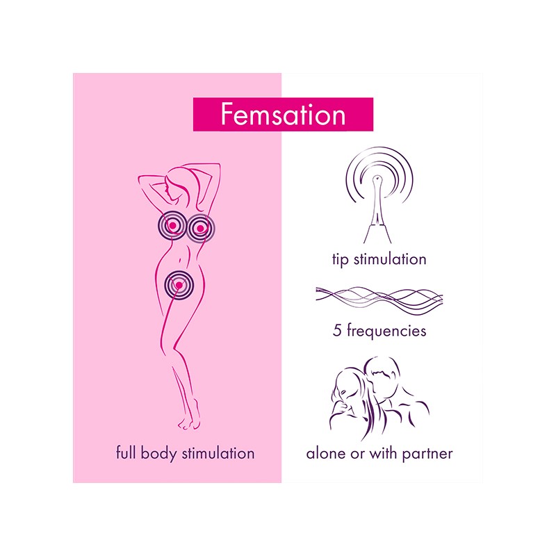 Poczuj się jak kobieta dzięki temu masażerowi łaskoczącemu Rianne S. Precyzyjna stymulacja tworzy intensywne i wyjątkowe doznania. Femsation jest idealny do używania samodzielnie lub z partnerem podczas uprawiania miłości, ponieważ jest mały i łatwy do trzymania w dłoni. Dzięki 5 częstotliwościom możesz wybrać idealną wibrację, która najlepiej Ci odpowiada. Dzięki Femsation możesz nadać swojej eksploracji zupełnie nowy wymiar.