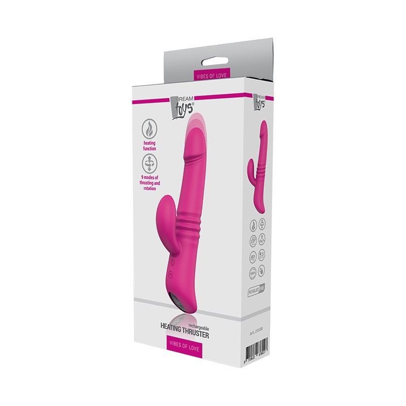 Heating Thruster ma solidny wał z 2 silnikami, żołądź i stymulujące grzbiety. Wibrator posiada również stymulator łechtaczki z własnym silnikiem. Dzięki 3 silnikom i 9 różnym wzorom wibracji może wibrować i stymulować najbardziej wymagających użytkowników. Ponadto wał wibratora ma ruch w górę i w dół oraz ruch obrotowy. Kolejną cechą szczególną tej zabawki jest funkcja podgrzewania, która ogrzewa zabawkę do temperatury ciała. Przyjemność może zacząć się wcześniej, ponieważ jest bardzo wygodna dla części intymnych.